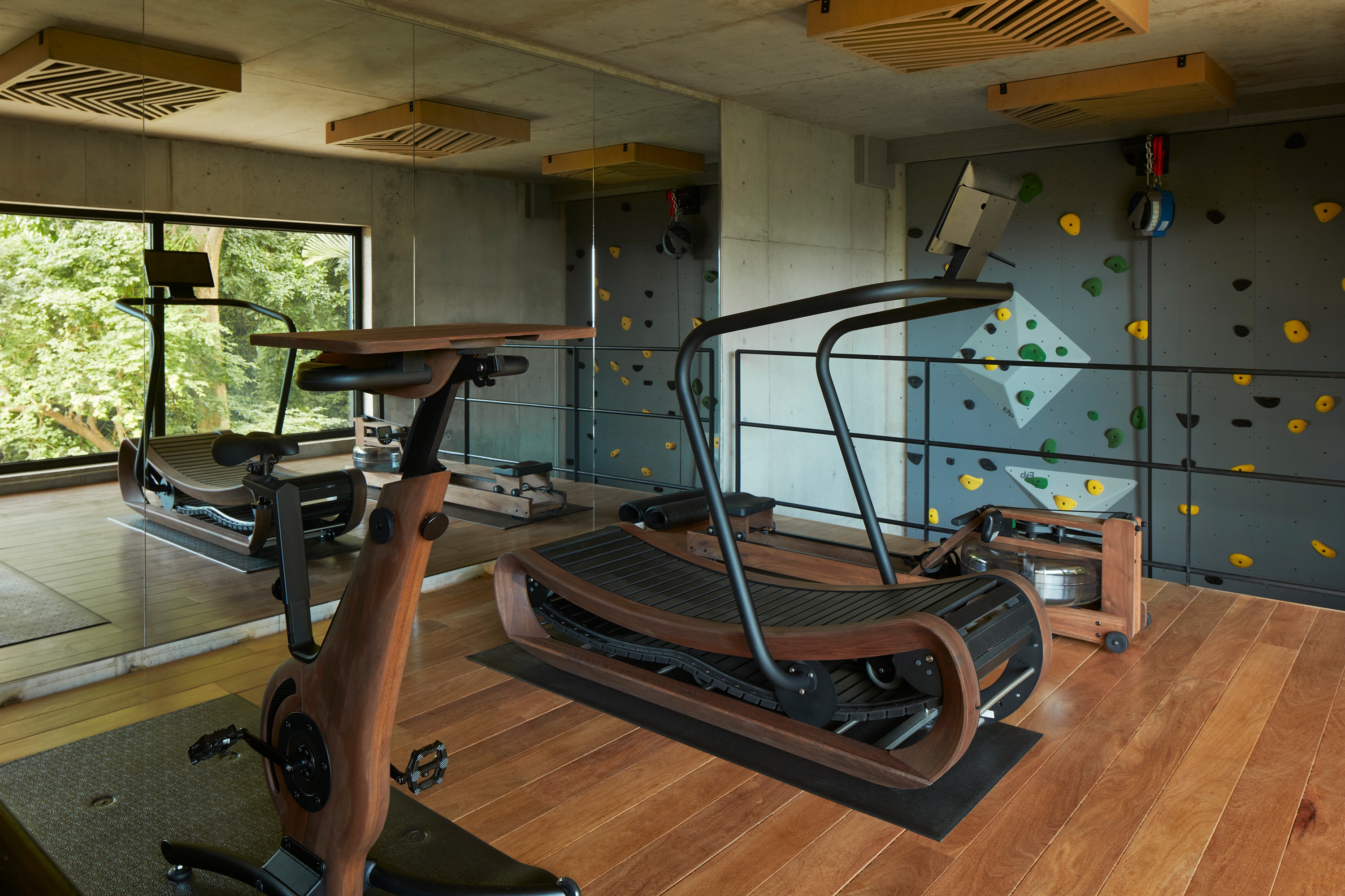 And for the wellness-minded: a yoga pavilion that overlooks a pond, a climbing wall, e-bikes and ATVs with trails throughout the property, hiking trails, a cold plunge and sauna, a private gym with stationary bikes, a Pilates reformer, a treadmill, water rower, weights, boxing and speed bags, and a hyperbaric chamber.